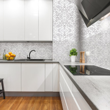 Skleněný obklad byl přizpůsoben konkrétním rozměrům kuchyňské linky i dispozičním možnostem bytu. Díky výrobě na míru bylo možné přesně vyřešit návaznost na pracovní desku, skříňky i technické prvky bez narušení celkového designu interiéru.