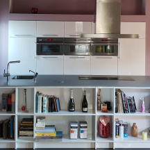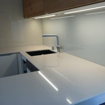 Obklad byl přizpůsoben konkrétním rozměrům kuchyňské linky i uspořádání prostoru. Díky výrobě na míru bylo možné přesně vyřešit návaznost na pracovní desku, horní skříňky i technické detaily, aniž by došlo k narušení celkového konceptu kuchyně.
