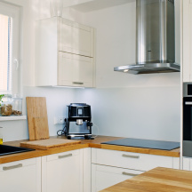 Obklad byl přizpůsoben konkrétní dispozici kuchyňské linky, včetně přesného řešení rozměrů a technických detailů. Díky výrobě na míru bylo možné zajistit plynulé napojení na pracovní plochu a ostatní prvky kuchyně bez rušivých přechodů.